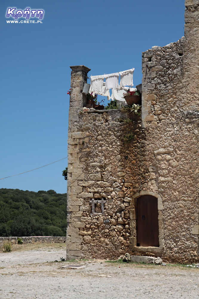 Ze względu na brak dróg poprzecznych wschód-zachód prowadzących z tego miejsca musieliśmy wrócić do miejscowości Apostoli. Tam skręciliśmy już w odpowiednią stronę i po dojechaniu do sąsiedniej miejscowości Kalogeros udaliśmy się w kierunku Moni Arkadiou. Ponieważ ten klasztor już zwiedzaliśmy w 2009 roku zrobiliśmy sobie tylko krótką przerwę by chwilę odpocząć od jazdy i zrobić kilka nowych zdjęć na zewnątrz klasztornych zabudowań.