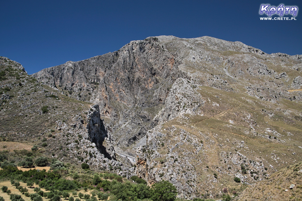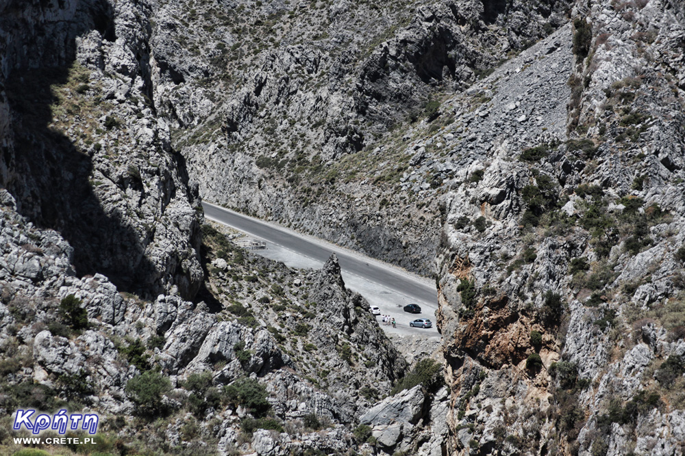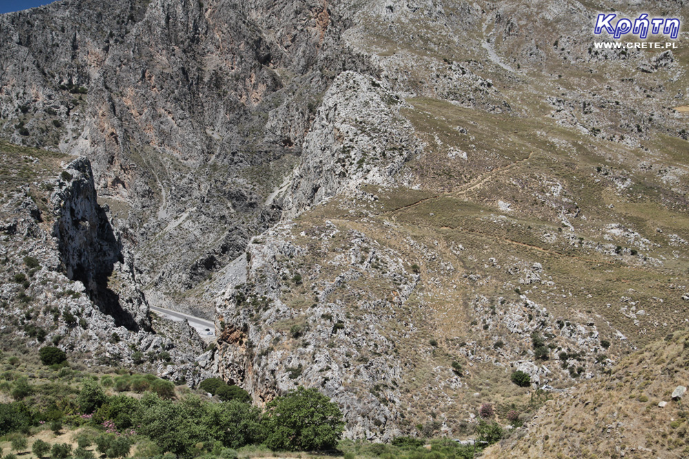 Ponieważ tego dnia zamierzaliśmy pojechać na wykopaliska w Elefthernie oraz do jaskini Melidoni znajdujących się relatywnie blisko Plakias, postanowiliśmy, że nie będziemy jechać wygodnym połączeniem, jakie zapewnia Nowa Droga Narodowa, lecz przejedziemy nieco na przełaj mniejszymi lokalnymi drogami. Plan ten wdrożyliśmy w życie skręcając z głównej drogi tuż za wąwozem Kourtaliotiko i tym samym kierując się na niewielką wioskę Frati. Ta droga była nam znana z naszych poprzednich wakacji, więc stromy podjazd, jaki znajduje się na jej samym początku nie stanowił dla nas większego zaskoczenia. Jedną z zalet tej drogi jest piękny widok z góry na wąwóz Kourtaliotiko.