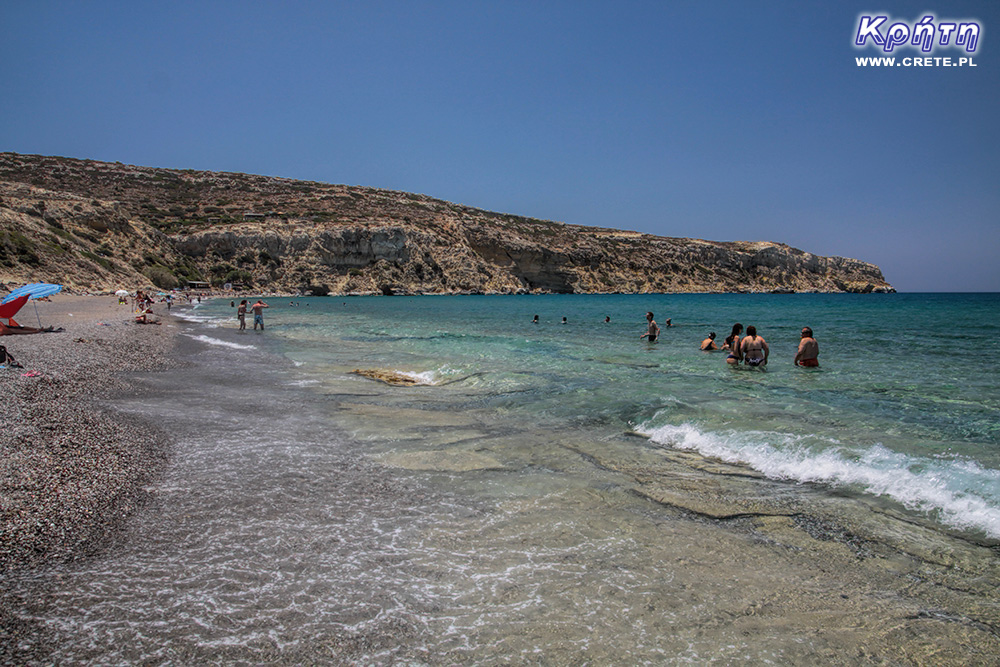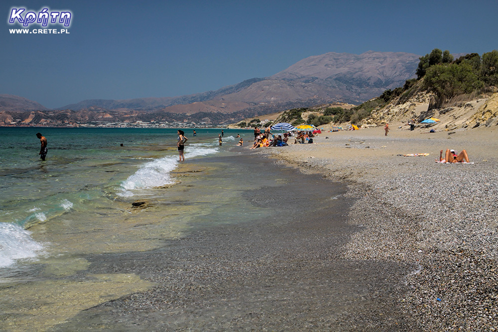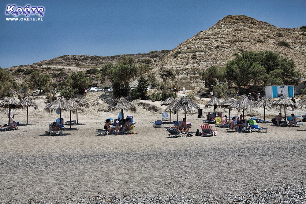 Plaża w Kommos okazała się bardzo ładna i piaszczysta. Zejście do morza jest tu stosunkowo łagodne, dno zbudowane jest z dużych kamiennych płyt. Tuż przy brzegu znajduje się spory nasyp kamieni naniesionych przez fale. Niestety oddzielają one leżaki od morza, więc chcąc się wykąpać trzeba przez nie przejść, co nie jest najprzyjemniejsze, ponieważ są one bardzo (!) nagrzane. Przypominało to trochę bieg po rozżarzonych węglach.